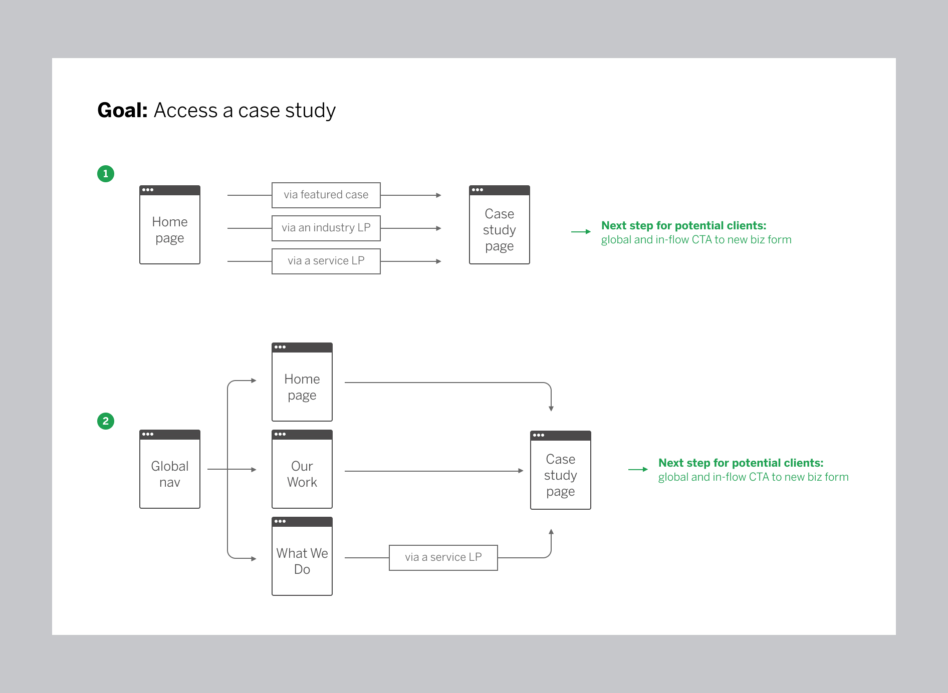 I created user flows and use cases to imagine steps in users’ journeys and to identify system requirements. A competitive analysis of websites in this space helped me discover user needs by proxy while also identifying industry design trends. Looking into the Google Analytics data, I identified which pages users were currently viewing the most and also discovered that 66% of users in the last year were browsing the website through desktop devices.