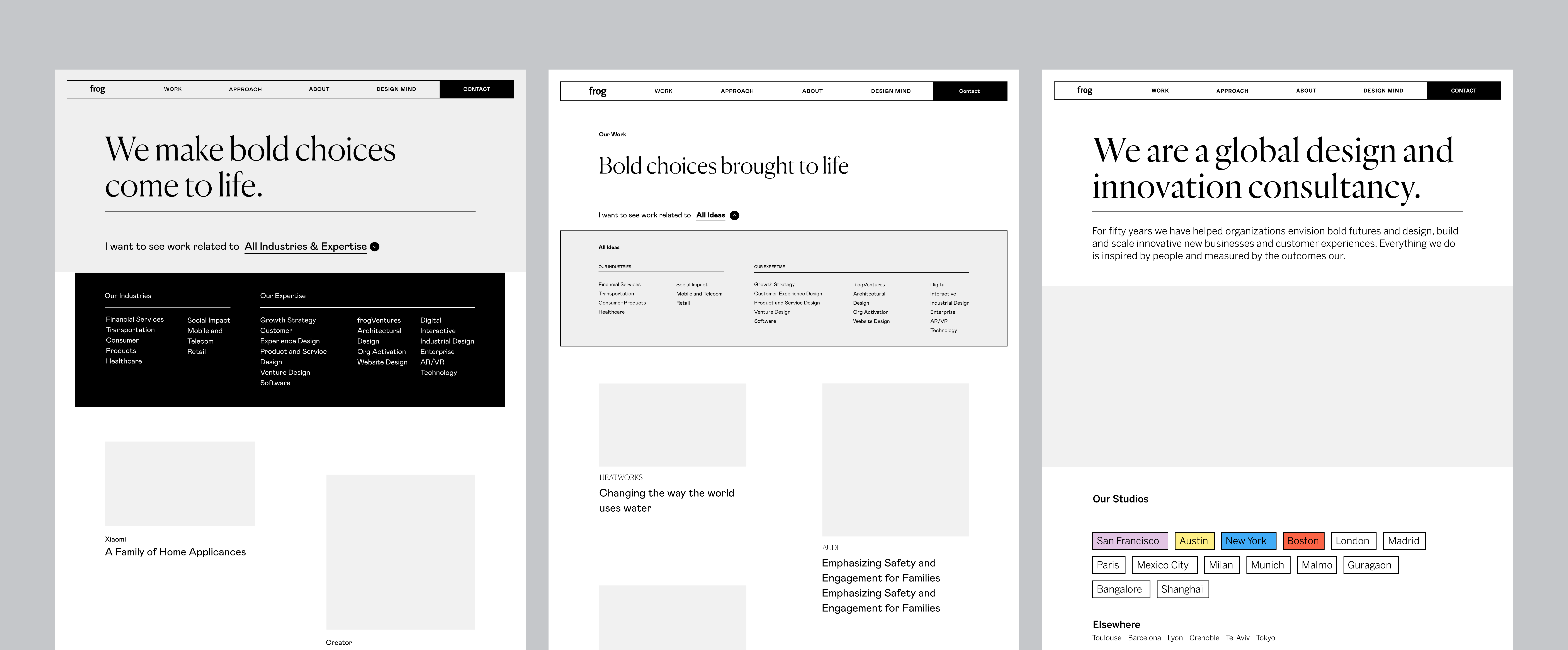 At the end of 2019, I joined Frog Design, a global design and strategy firm, for a 5-month project to redesign their public-facing website, frogdesign.com. I led interaction design and user research for this project.
